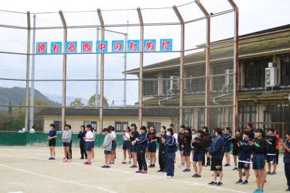 放課後、グラウンドで春季総合体育大会開会式に向けて、「行進練習」を行いました。4月27日、西京極陸上競技場で京都市の中学生7000人が集まります。本校でも100人の「チーム西賀茂」として参加します。男女で声をかけて、足をそろえて元気に行進できるよう頑張りました。最初の練習でしたが、素晴らしいできばえでした。