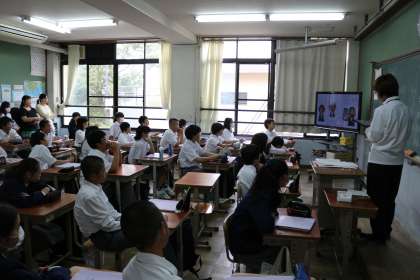 1年生は、道徳で「情報モラル」について、ケータイの使い方を見直し、自分たちの考えで正しく判断して行動できる力を養う内容でした。授業のまとめとして、クラスのSNSルールを策定しました。1年生のフロアは多くの参観される保護者でいっぱいでした。