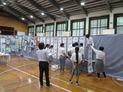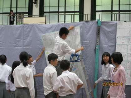 放課後、学習発表会前日準備で、展示会場となる体育館の準備が行われました。係に当たっている生徒が作品の飾り付けなど行いました。玄関には美術部が作成した「黒板アート」が飾られています。