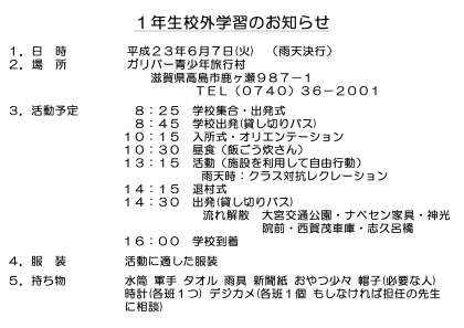1年生の校外学習はすでにプリントでお知らせしておりますが、以下のような内容になっています。新入生にとって初めての校外学習です。学級の親睦を深めるとともに、クラスの団結をさらに深めてほしいと思います。