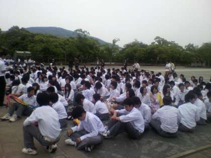 今五午後5時45分です。原爆資料館を見学したあと,平和記念像の前で平和のセレモニーを行いました。これから宿舎に向かいます。予定より少し早く進んでいます。