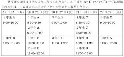 三蜜を避けるため,各学年・クラスごとに登校日・登校時間が異なり