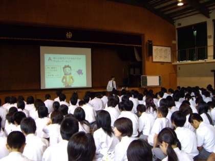 7月8日(水)6限 2年生は、体育館で「正しい薬の使い方とアルコール」について京都市の学校薬剤師会の先生による講演がありました。午後から体育館は暑くなってきたのですが、集中して話が聞きけました。