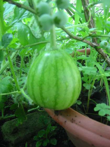 中庭に「スイカが育っていますよ」大きくなーれ!