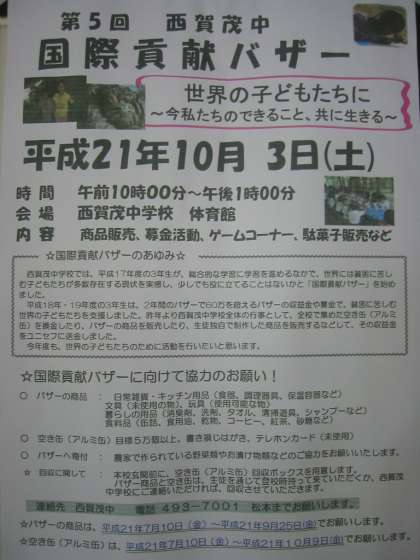 HPの配布物一覧の中の「お知らせ」−「国際貢献バザーのお知らせ」のプリントがあります。また、三者懇談会等に配布される予定です。