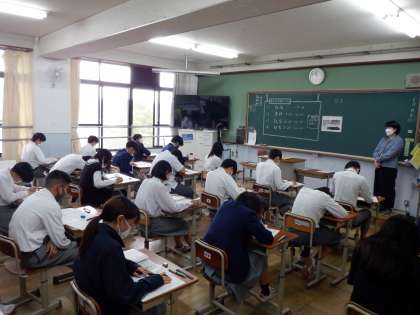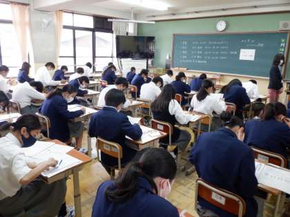 本日より3日間,第2回定期テストが始まりました。1年生にとっては,初めて全教科の9教科の実施となります。テスト前の学習時間では,ノートも見返したり,教科書で確認をしたりと,時間を惜しんで取り組んでいました。テストも,真剣に問題に向き合い,最後までやり切っていました。残り2日間。最後の最後まで番場ってほしいと思います。