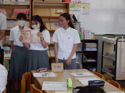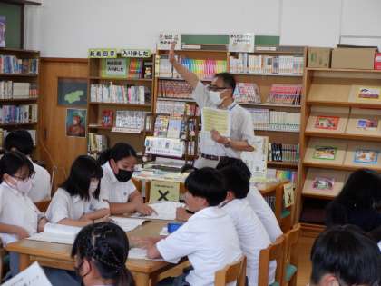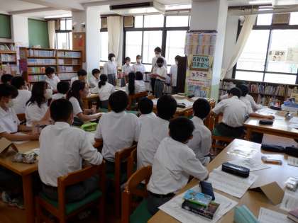 1年生の国語科の授業で図書館司書さんによる学校図書館のオリエンテーションを行いました。図書室の利用方法や本の紹介,本の探し方や配架場所,著作権の説明等を受けました。後半は,「学校図書館を使いこなそう!」というテーマで,班ごとに目当ての本を探し,本から情報を取り出し,発表を行いました。今回の授業が,さらに学校図書館を活用できるきっかけになればと思います。