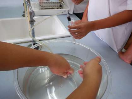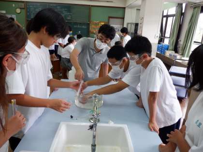 1年生の理科では、「身のまわりの気体」について学習しています。本時の学習課題は、「どうしたら身のまわりの気体を集められるだろうか」です。様々な気体を集める方法を学習し、今回は水上置換法によって、酸素や二酸化炭素を集める実験を行いました。段取りよく進めないと気体が発生し終わってしまったり、気体を逃してしまったりと失敗しながらも楽しく実験を進めることができました。