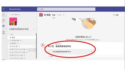 Teams → 【京都市】西賀茂中学校 → 1つの非表示チャネル → 00進路 → 投稿欄 より ご視聴ください。