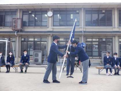 認証式に先立っての引退式では、旧生徒会本部役員1人ひとりから、全校生徒へむけてメッセージを伝えました。続いて、新本部役員の認証があり、生徒会旗の引継ぎが行われました。
