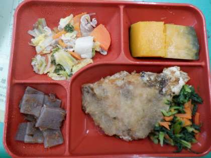 また、本日の給食は、冬至献立でした。冬至にカボチャを食べる風習から、「かぼちゃの煮付け」がだされました。ゆず果汁を使った手作りおろしだれのかかった鰈(かれい)のみぞれかけ」も人気でした。