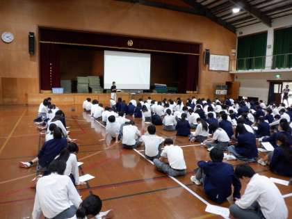 2年生では、学年集会の形で、総合的な学習の時間のオリエンテーションを行いました。これから学習を進めていく高校調べや職業調べについて説明を受けました。