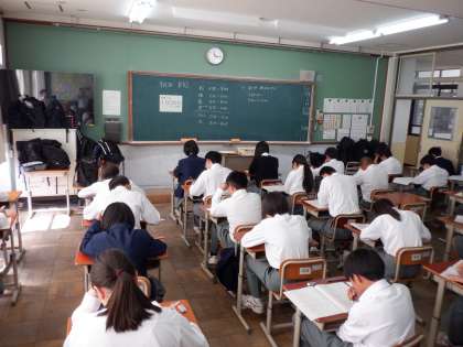 現在は、3時間目です。1年生は数学、2年生は英語、3年生は理科のテスト中です。