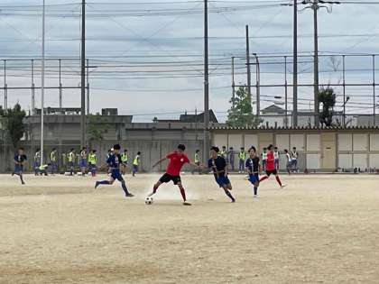 4月27日(土)、サッカー部は勧修中学校を会場に、二条中学校と対戦しました。とても落ち着いた試合運びで、見事1-0で勝利しました。翌28日(日)には、洛南中学校を会場に、久世中学校と対戦、惜しくも3-1で敗れました。しかしながら、自分たちのペースを作るために、とても考えながらプレーをしていたこと。そして、身体の大きな相手選手にも果敢にプレスをかける様は、必ず夏の大会につながると確信しました。次に向けて、ぜひがんばってください!