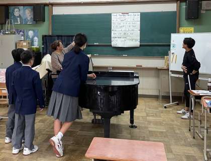 昨日、支援ルームでの音楽の授業にお邪魔しました。担任の先生のピアノに合わせて、歌ったり体を動かしたりと、なんとテンポの良いことか!私も“Head shoulders knees and toes”に参加しましたが、普通のテンポからどんどんスピードが速くなり、英語で歌わなければいけないわ、頭、肩、膝、つまさきと触らなければいけないわ、もうこちらはパニックでした!生徒の皆さんは、楽しみながらきっちり素早く触っているので、少しジェラシーを感じました!
