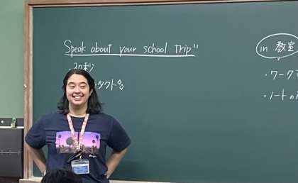 3年生の英語では、修学旅行の思い出について、GIGA端末を使ってプレゼンテーションをつくり、ALTの先生にプレゼンするという、パフォーマンステストを行っています。みんな、英語を話すことが楽しそうで、発表順を決めるジャンケンも、英語で行っていました。順番に廊下で発表しますが、英語の会話になっています!お気に入りのアトラクションは「ビッグサンダーマウンテン」だそうです。聞いているこちらも楽しくなってきました!
