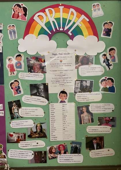 ※写真は、2年生の「優しい日本語」について考えた成果二つと、職員室前廊下に掲示されているEnglishボードの6月号「ジェンダー・LGBTQについて」