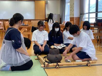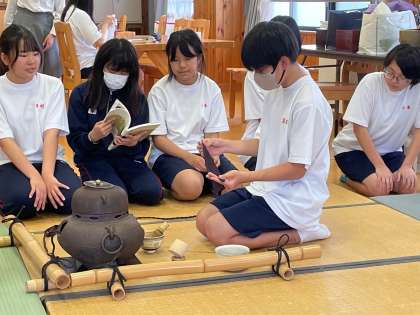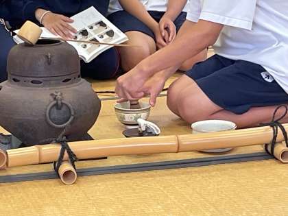 放課後、茶道部の練習にお邪魔しました。だれかお点前を見せてください、とお願いすると、すぐに披露してくれました。その所作は見事なもの、一連の動作が流れるように行われます。袱紗捌きや柄杓の使い方も堂々たるもの、見惚れてしまいました。和敬静寂、主人と客が互いの心を和らげてつつしみ敬い、茶室の品々や雰囲気を清浄な状態に保つことを意味しますが、それを体現するお点前でした。ホッと肩の力が抜ける良い時間をいただきました!
