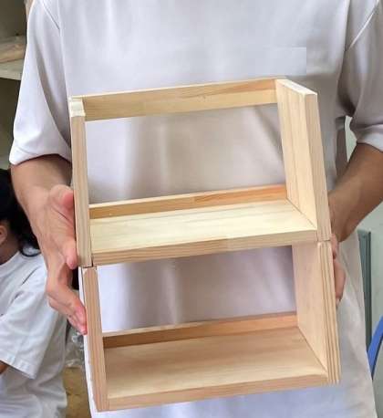 2年生技術では、木材を使って、オリジナルの木工作品をつくっています。木の板の形や大きさを踏まえ、いくつかのバリエーションに沿って設計図を描き、形を切り出します。パーツがそろえばくぎを打ち、組立ます。大切なのは「丁寧さ」。そのなかで「速さ」も求められるからなかなか大変です。ドリルやかなづちを使う横顔は真剣そのもの、いい顔してますね!出来上がった作品、世界で一つの作品ですから、おうちで大切に使ってくださいね。ちなみに、私も中学生の時に作った作品、今でも使っています!