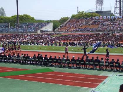 晴天のもと、平成24年度春季総合体育大会開会式が西京極陸上競技場で行われました。西賀茂中学校は交流校であるいわき市立小名浜第1中学校から送られたメッセージフラッグと「東日本に元気と笑顔を」の垂れ幕を持ち、堂々の入場行進を行いました。