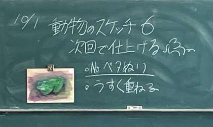 6限、美術室にお邪魔すると、1年3組の皆さんが、木の板に鉛筆や水彩絵の具で動物を描いていました。それが本当に上手なんです。カエル、恐竜、猫、ライオンなどなど、題して「動物のスケッチ」。なぜこんなに上手に描けるのでしょう?