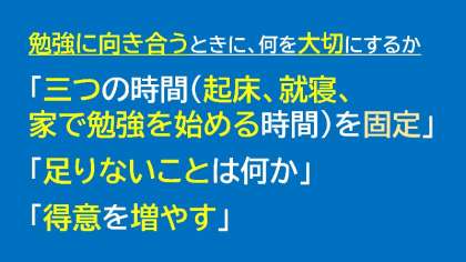 大切なのは、睡眠時間の確保です。6時間は最低寝てください。でないと、頭が必要な場面で機能しません。テスト前だからといって、寝る時間を遅くしても、慣れない体は疲れるだけです。だからこそ、家で学習を始める時間を決めましょう。そして、残り時間を計算して、取り組む内容を割り振りましょう。寝る時間を決め、その時間になったら必ず寝ましょう。SNSや動画を見る時間は、ちょっと我慢しましょう。今自分にとって何が一番大切か、優先順位をつけ、それが実行できる「自律」した心を鍛えてもらいたいと思います。