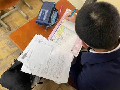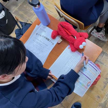 2年生の総合的な学習の時間では、先週行われたチャレンジ体験学習で、お世話になった事業所の方々へのお礼状を書きました。手紙文の書式に則って、お礼をしたためるわけですが、皆さん良い体験をさせていただいたことが伝わるように、たくさん書き連ねていました。心に響く体験をさせていただいたとき、人は成長します。金曜日には、改めて事業所の皆さんを訪ね、お礼を述べますが、成長した姿を見てもらってきてください!