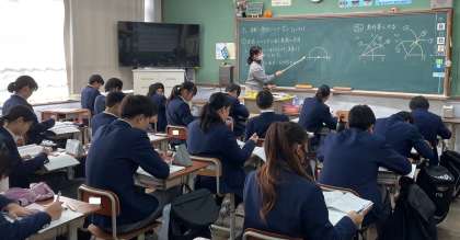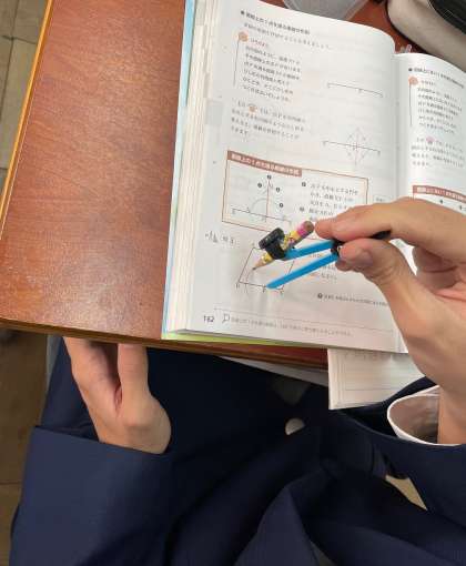 1年生の数学では、コンパスを使って垂直二等分線を引く練習に取り組みました。P点を好転とする垂直二等分線を引くときに、まずは何をすればよいのか。やり方の手順もそうですが、なぜその線を引くのか、P点から同じ距離の点を作って、そこから改めて二つの弧を描くことで…といったその線を引く理由を考えながら描いてみてもらえると、さらに理解が深まります。論理的に説明することを考えながら、これからも描いてみてくださいね!