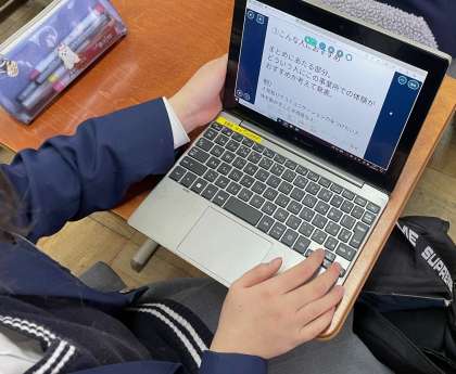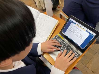 2年生の総合的な学習の時間では、2学期に行われたチャレンジ体験学習の振り返りをまとめ、1年生に向けて発表する準備を進めています。さまざまな事業所様で働かせてもらった経験からどのような力を身に付けることができたと思うか?その理由は?と、自分たちの取り組みを振り返ります。