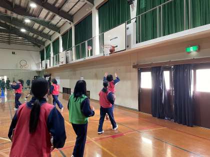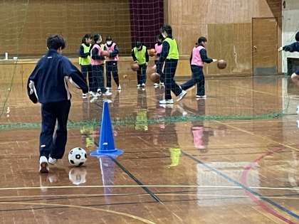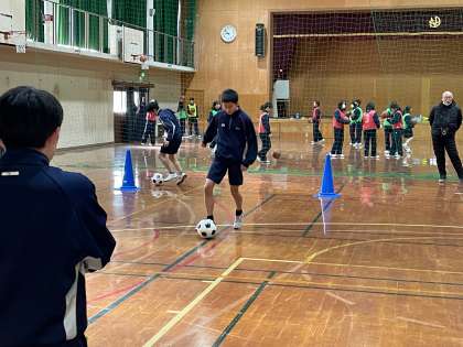 先週のことになりますが、雪が降りしきる日は外で体育をすることができません。そこで、2年生の体育では、体育館を反面ずつ使って、男子がサッカー、女子がバスケットボールを行っていました。サッカーは、ドリブルをハーフラインで往復する練習をしていました。面白いのは、レベルが上がると二人一組で手をつなぎながらドリブルをする練習です。みんな器用に息を合わせながらボールを蹴って進み、戻ってくる様子は、ちょっとした強いチームの練習を見ているようでした。また、バスケットボールでは、シュート練習をボードを使ってするのですが、リング横のボールを当てるポイントを意識して、上手くバウンドさせてシュートさせていました。狭い場所でも効率よく取り組むと、どんどん上達しますね!