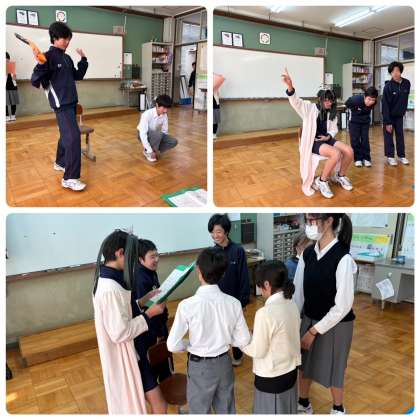 左上の写真は、かぐや姫が竹から生まれて驚くお爺さんです。驚く様を英語でしっかり伝えてくれました。そこからお婆さんのところへかぐや姫を連れて行く場面、大きくなったかぐや姫が月に帰らねばならない場面と続きます。全編英語のセリフを貫き通したのは圧巻でした。また、動きも自然で、セリフの意味が自分の中に入っているからこそだと感じさせるものでした。きっと繰り返し稽古したのでしょうね。演劇の手法を学習に取り入れた「ドラマ」は、表現することを通じて、なぜその言葉や動きをするのかその意味、意義を考え、それが観る人にどのように伝わるのか、振り返り磨きをかけていきます。英語のセリフの意味を体感しながら表現することは、学びが生きて働くので、身体に英語が染み込んでいきます。
