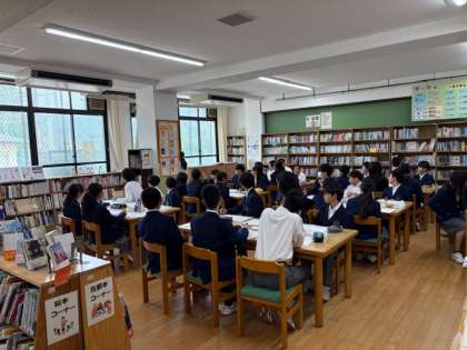 今日の1時間目、図書室では1年生対象図書館オリエンテーションが開かれています。学校司書の先生から、図書館の使い方、マナーなど、本と親しむためのレクチャーをしていただきます。「周りにある本、全て何冊あるでしょうか?」の質問に、「1600冊」「800冊」の声がある中、学校司書の先生から「桁が違います」との反応。さあ、いったい何冊あるか、皆さんご存じですか?