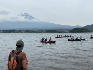 河口湖は、波もなく穏やかな様子です。カヌーには、良い条件のようですね。