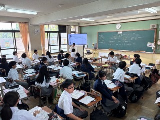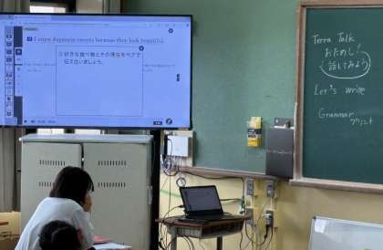 英語科では、今年度導入された英語学習アプリ「Terratalk」の運用を始めました。Terratalkは、いつでもどこでもGIGA端末があれば、英語学習が可能です。発音する声を聴いて応えたり、設問に対して選択肢を選んだりと、自分で英語学習にどんどん取り組むことができます。おうちででもできるので、端末も持ち帰って、毎日やってみてください。教室では、好きな食べ物とその理由を英語でやり取りする様子が見られました。ちなみに、私も始めてみようと思いますので、また英語でお話ししましょう!