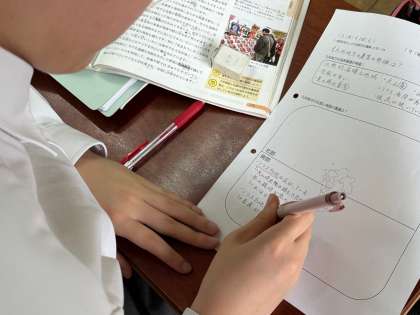 2年生社会科では、地理的分野の「日本の諸地域」という単元の中で、九州地方について勉強しています。今日は、自分で教科書から読取り、課題についてまとめます。課題は「九州地方の北部と南部では、どのような農業が営まれているか」です。九州地方の地形の特色は、平野も多いうえ、火山によって形成されたシラス台地が有名です。日本の農業の中心地のひとつであり、その農業の特色は気候や地形を存分に生かしたものといえるでしょう。