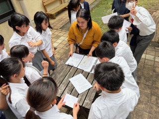 6月16日(月)の昼休み、中庭ではEnglish Cafeが開かれました。ALTの先生から、プリントに書かれた指令に基づき、Englishボードに書かれている情報を読み取りに行きます。職員室前のボードには、たくさんの人が集まって、熱心に読み込んでいました。英語で書かれた問題をもとに、英語のボードを読む、一緒に参加してなかなか本気で頭を使った時間になりました。最後は、ALTの先生にマル付けしてもらってミッション終了となります。英語に浸る時間を楽しむことができました!