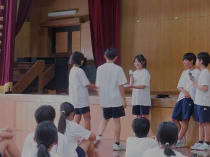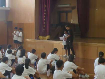 15日の4時間目、体育館にて1学期のふりかえりを行いました。1学期を通して良かったことや2学期へ向けて改善していきたいことなどを各クラスの代議員が発表しました。元気よく過ごせたという感想や、ベル着がもっとできるようにしたいという目標など、各クラス一生懸命考えられた内容でしたね。生活委員からは、1学期に各クラスがどれだけベル着ができたかのランキング発表と、最もベル着ができたクラスの表彰を行いました。2学期も引き続き頑張っていきましょう。