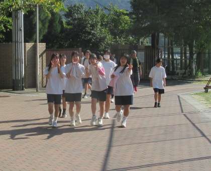 先週金曜日に代議専門委員会後行われたので、今朝はあいさつ運動が行われました。生活委員会の皆さんを中心に、あいさつをしてきてくれた帰りのワンショットです。朝学活では、委員会からの報告があり、代議会からは9月の月目標として、最高のエールを送り合うことを掲げてくれたと聞きました。今日からの合唱コンクールに向けた取組、ぜひ楽しんでよいものを創り上げてくださいね!また、生活委員会からは、ミニ生徒総会の件も報告されていました。次の世代へ引き継ぐ準備、期待しています!
