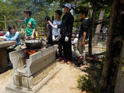 青空の下,飯ごう炊飯や大縄跳びを