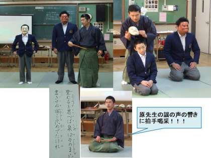 「少しでも能に興味を持ってくれたらうれしいです。短時間のふれ合いでしたが、生徒の皆さんが真剣に聞いてくださったことが、大変うれしいです。」とのコメントをいただきました。原先生、ありがとうございました。