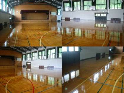 この学校閉鎖の期間中に体育館の油引きを業者の方に来てもらって行いました。体育館は鏡のように輝いています。大切に使いましょう!