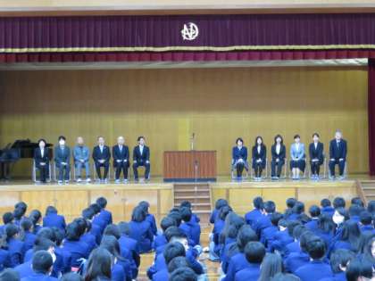 長くて8年、短くて1年間西賀茂中学校の教育に携われてこられた離任・退職される先生からお別れのことばをいただき、来年度校長に昇任される教頭先生からは西賀茂中学校で過ごした日々や生徒の様子、3年間での本校が変わっていったことなどをお話しいただきました。