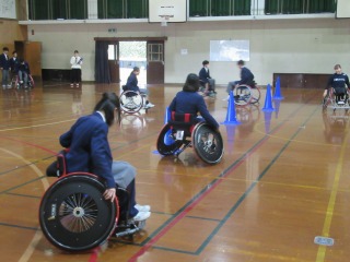 その後、クラス対抗車いすリレーが行われ、順に車いすを操作します。車輪をうまく回すには、やはりコツが必要ですね。加えて、上手く力を入れることが大切だと感じました。皆さんは体感してみてどうでしたか?
