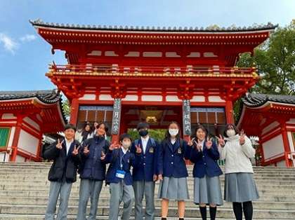 青く澄んだ空の下、子どもたちは笑顔で八坂神社の西楼門をくぐりました。お参りをしたり、おみくじを引いたり、並ぶ屋台を見て楽しんだり…。それぞれが充実した時間を過ごしていました。