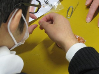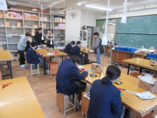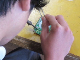 昨日、1組さんの技術の授業では、ハンダづけに取り組みました。ハンダとは、機械の中にある「基盤」という板に、小さな部品を取り付けるための金属の接着剤です。ハンダをハンダごての先で熱して溶かし、ちょっとだけその部品の根元に付けることで、ハンダが固まれば部品が取り付けられる、というしくみです。基板に取り付ける小さな部品は「コンデンサー」というもので、電気の流れを整えるものです。基板に空いた小さな穴にコンデンサーの金属の棒を差し込んで、その根元にハンダを流しつけます。ハンダごては熱いので、注意深く付けていきます。細かい作業ですが、みんな真剣な顔で取り組んでいました。まさに「技術」の勝負、ぜひハンダづけをみにつけて、将来機械を組み立てられるようになってくださいね!