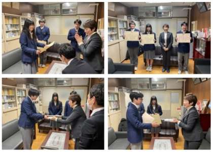 3年生で取り組んだ「税について作文」で、3名の生徒がみごと受賞されました。本日放課後に、北区長と上京税務署の方が来校され、校長室にて授賞式を執り行いました。受賞内容は以下の通りです。