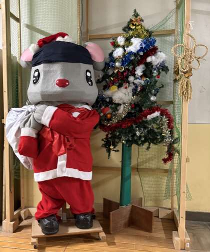 にしちゅーサンタ、登場です!胸には赤いリボンが付いています。装いも新たに、懇談会に来られる皆さんへ「メリークリスマス!」