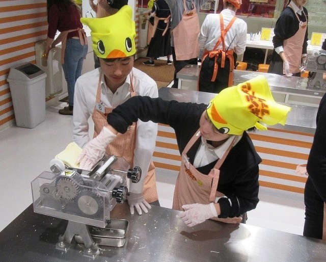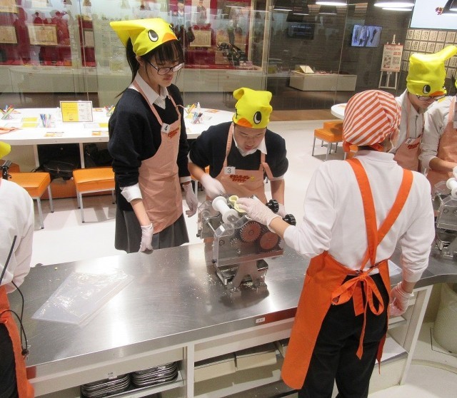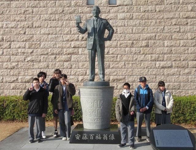 先週の金曜日、1組は校外学習に出かけました。行先は大阪・池田のカップヌードルミュージアムです。地下鉄や阪急を乗り継いで、阪急池田駅まで向かいます。道中、自分たちでルートや乗換を確認しながら進みました。阪急の乗換に詳しい人がいたので、安心して向かうことができました。なお、カップヌードルミュージアムとは、インスタントラーメンを開発した安藤百福さんの記念館で、チキンラーメンを自分たちで作ったり、オリジナルのカップヌードルを作ったりすることができます。到着すると、さっそくチキンラーメンを作ります。驚いたのは、本当に小麦粉を練るところからスタートするということで、黄色いひよこちゃんの三角巾とエプロンをつけて取り組みました。みんな、講師の方のレクチャーのもと、一所懸命に取り組みましたね。粉をこねたらマシーンに通してさらに練って広げてカットします。カットできた麺に味付けして、適正な量に測り取れば、油で揚げてもらいます。インスタントラーメンってこんな風に作るんですね!出来上がったものを袋詰めして完成です。オリジナルのパッケージに詰めてもらったものと、実際に工場で作っておられるものと、ぜひおうちで比べてみてください、とプレゼントしてもらいました。このほか、オリジナルカップヌードルも作らせていただき、大満足の一日でした。カップヌードルミュージアムのみなさん、本当にありがとうございました!