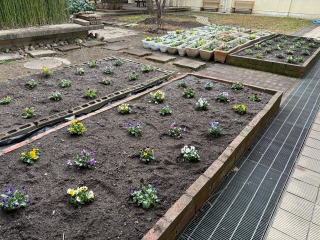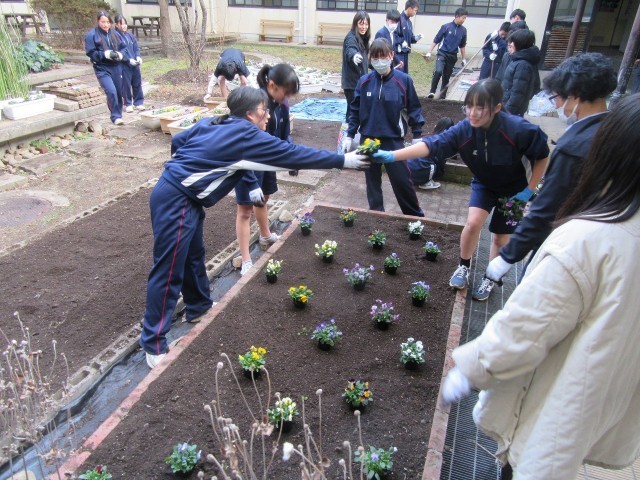 昨日の放課後、衛生委員会では、中庭の花植えを行いました。先週に実施予定だったのですが、雪のため延期していました。この活動で整備したプランターは、3年生の卒業式や新年度の入学式の時に、花道として使われます。ポッドのお花を植え替えるために、土をならし、穴をあけ、丁寧に植え替えます。みんなで手際よく声を掛け合いながら取り組んでくれたおかげで、あっという間に完成していました。お花がしっかりと根付き、きれいな花を保ってくれることでしょう。衛生委員会のみなさん、お手伝いいただいた先生方、土の入換えをしてくださった管理用務員さん、本当にありがとうございました!
