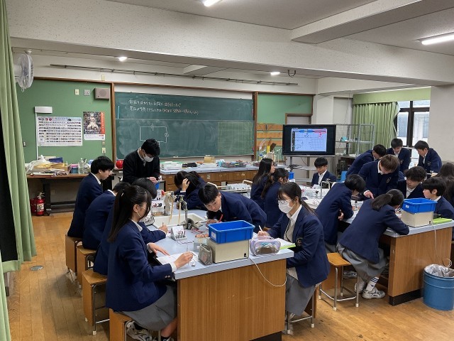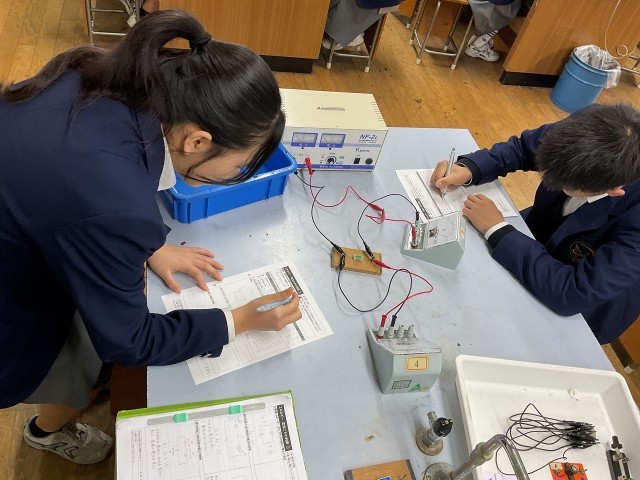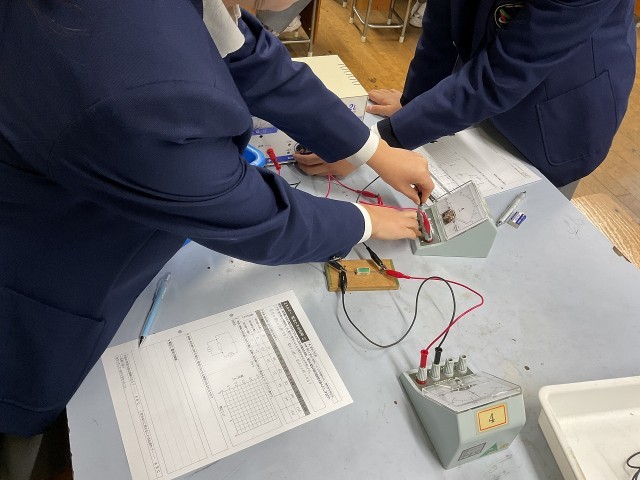 2年生理科では、電圧と電流の関係について学んでいます。ちなみに、皆さんは電圧と電流って何か、説明できますか?さらに言えば、電圧がどうなれば電流はどうなる、といった形で、その関係を説明することはできますか?私も日常、様々な電化製品を使う中で、「しくみ」を理解して説明できるか、改めて考えました。実験では、3種類の抵抗器に対して、電圧を変えながら電流の流れ方を測定していました。抵抗器を繋ぎ変えたり、電圧のかけ方に対して電流計を繋ぎ変えたりと、協力しながら条件を変えて測定します。グラフに記録をしていくと…!おー、わかりました。こんな風になるんですね!次の授業で実験結果をもとに考察するそうなので、説明を楽しみにしています!